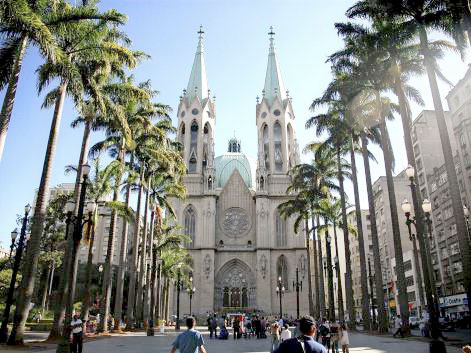該教堂始建於1913年,直到1954年,為慶祝建市四百周年倉促完工。它的前身是殖民時代的大教堂,整個工程由馬克西米利亞諾建築師設計建造。在藝術特點上,它融合了哥特式和文藝復興時期的風格。教堂的地下墓室安放著包括原印第安酋長在內的名人的靈柩。每扇玻璃窗上都反映著聖經裏不同的宗教主題。裏面還有多達一萬個聲管的義大利管風琴以及包含65 個小鐘的大套鐘。教堂前面的廣場從16世紀開始,就一直是每次盛大宗教遊行的出發點,正中央的“零起點”是測量聖保羅和其他城市距離的起點。主教堂從2000年開始關閉,進行裝修,耗時兩年,花費1950萬雷亞爾,到2002年的九月份才恢復對外開放。